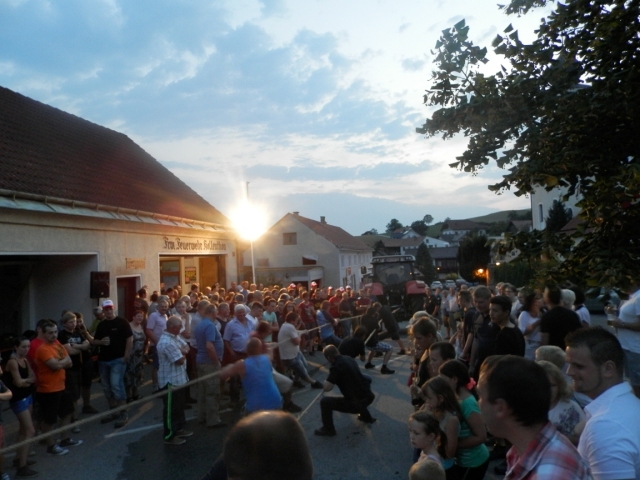 Am Freitag dem 14. August starte ab 17:00 der Heurigenbetrieb, wobei wir bald darauf bereits die ersten Gruppen für den mittlerweile schon traditionellen Seilziehbewerb begrüßen durften. Heuer war es der bereits 12. Bewerb (seit 2004) an dem diesesmal 9 Gruppen teilnahmen (FF Obereck, FF Hollenthon, FF Gleichenbach, FF Stickelberg, FF Spratzeck, Schwarzenbach 1 und 2, Jugend Hollenthon und die Feuerwehrjugend Hollenthon. Die heuer wieder sehr zahlreich Anwesenden Gäste und Zuschauer bekamen viele spannde Duelle zu sehen, wobei sich schon in den ersten Runden zeigte, dass die Sieger der letzten Jahre, die Gruppen Schwarzenbach 1 und Obereck, auch heuer wieder zu den Sieges-Favouriten zählen werden. Am Ende lautet das Finale auch wie erwartet FF Obereck gegen Schwarzenbach 1, wobei sich diesesmal die FF Obereck gegen den Vorjahres-Sieger durchsetzten konnte. Da letztes Jahr der Wanderpokal fix an Schwarzenbach vergeben wurde kam heuer ersmals ein neuer Wanderpokal (gespendet von der Fa. Fleischerei Seidl) zum Einsatz. Auf den weiteren Plätzen folgten die FF Gleichenbach und die FF Stickelberg.